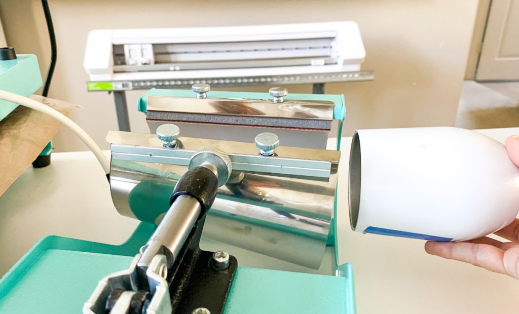 Use a Cricut mug press or ordinary mug press with heat and try to put a top lip inside the tumbler. Then all you should do is close the mugs and wait for the minute.