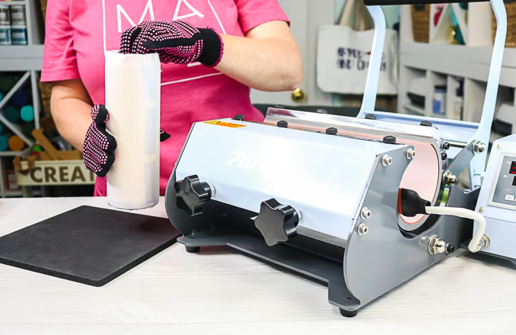 Put on heat-resistant gloves and turn on the heat tumbler press. Set the temperature to 350 Fahrenheit and set the timer for 50 seconds, most often both the timer and the temperature can be set on the machine itself.