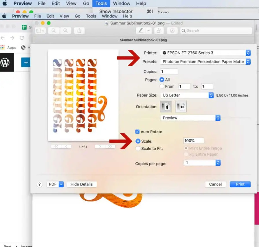 Once you are satisfied with the design, it’s time to get printing! Head over to File and hit Print: that will bring up your Printing Menu. With a few clicks of the mouse, select an Epson printer for best results – make sure those settings include Photo on Matte Paper as well; at 100% scale size for optimal sizing (which is normally pre-set by our amazing designers).