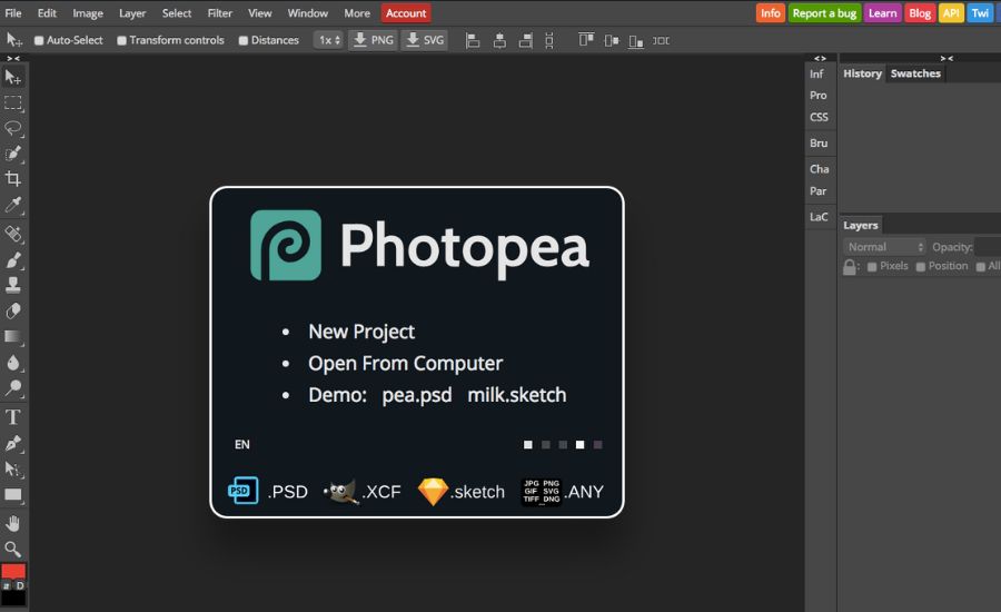 - Photopea is compatible with a wide range of file formats, such as PSD, XCF, and Sketch, allowing users to easily work with files from other image editing software.
